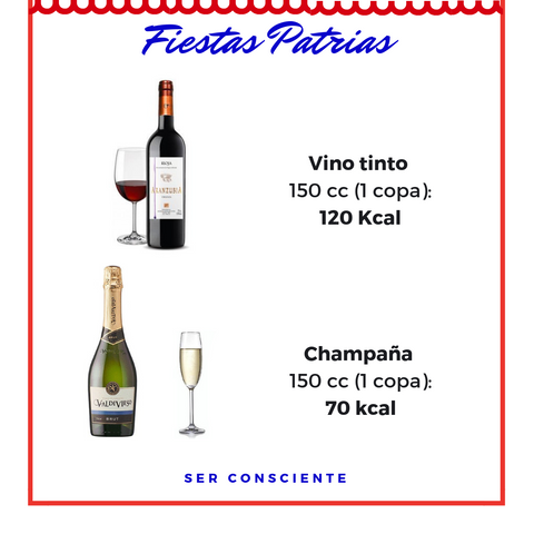 Para que se hagan una idea del aporte: si tomas 1 cerveza durante la tarde + 1 ponche partiendo la noche + 2 piscolas en el carrete nos da un total de 885 kcal. Si consideramos que serán 4 días de celebración se llega a 3540 kcal! es decir, medio kilo de peso!! Y sólo tomando lo que nombramos, ni siquiera contando el terremoto.